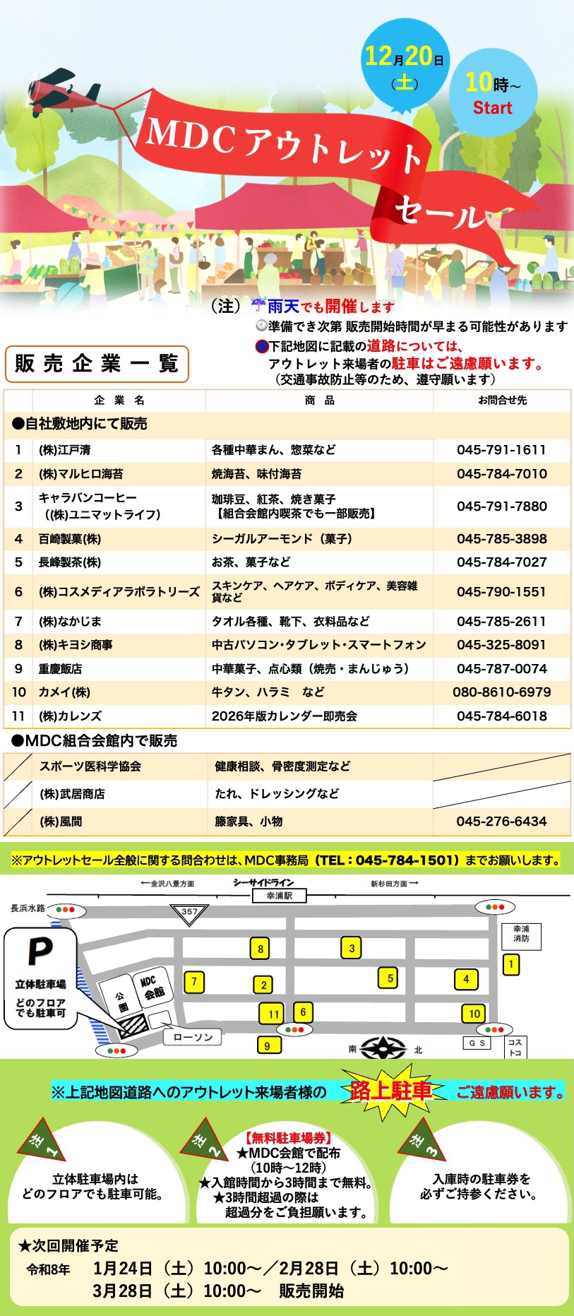 - ※MDCアウトレットセールは、シーサイドライン幸浦駅下車すぐ。
