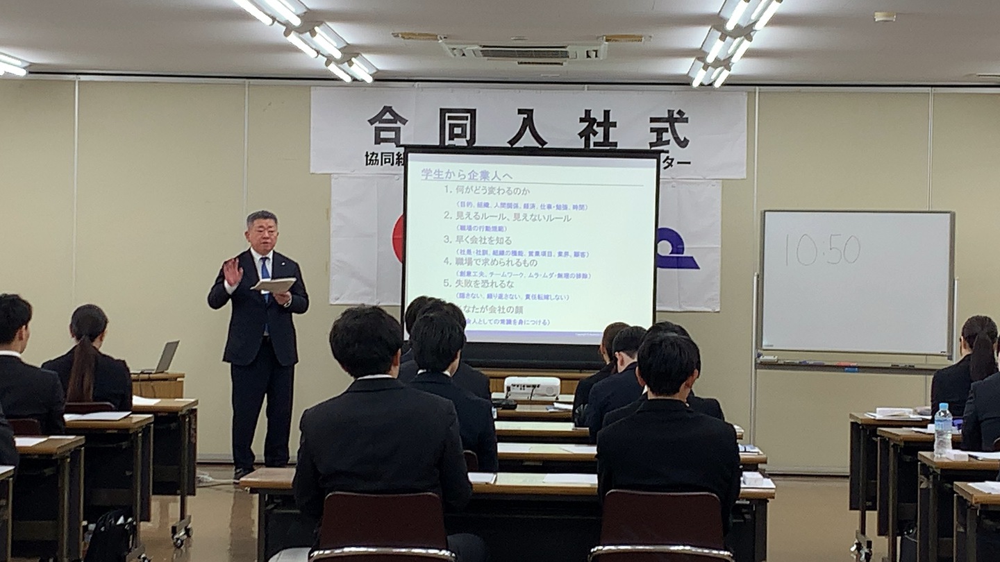 開式のことば、新入社員の方々の自己紹介のあと、木村理事長からの挨拶がありました。